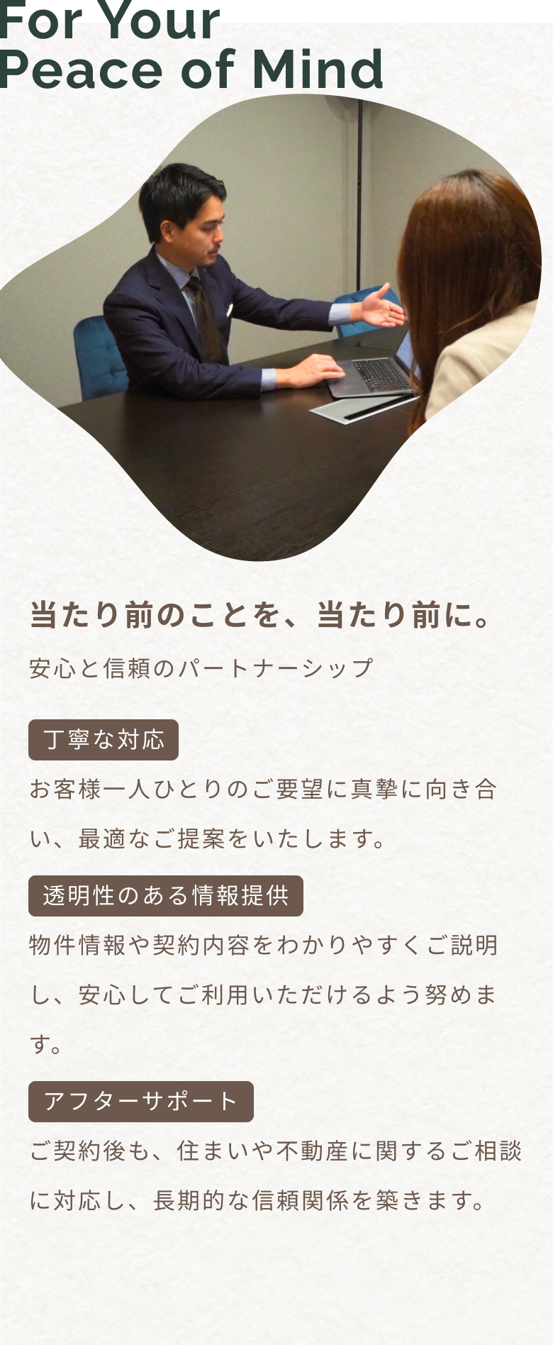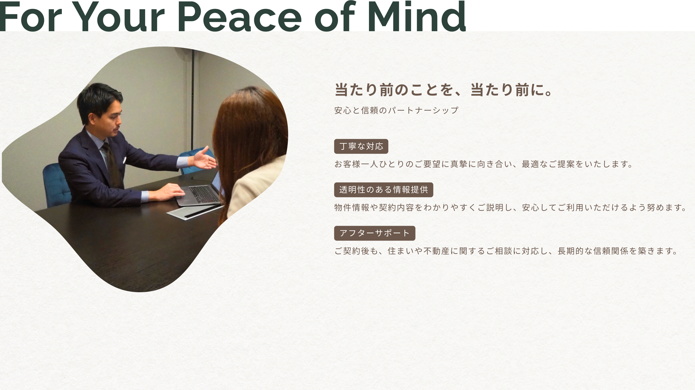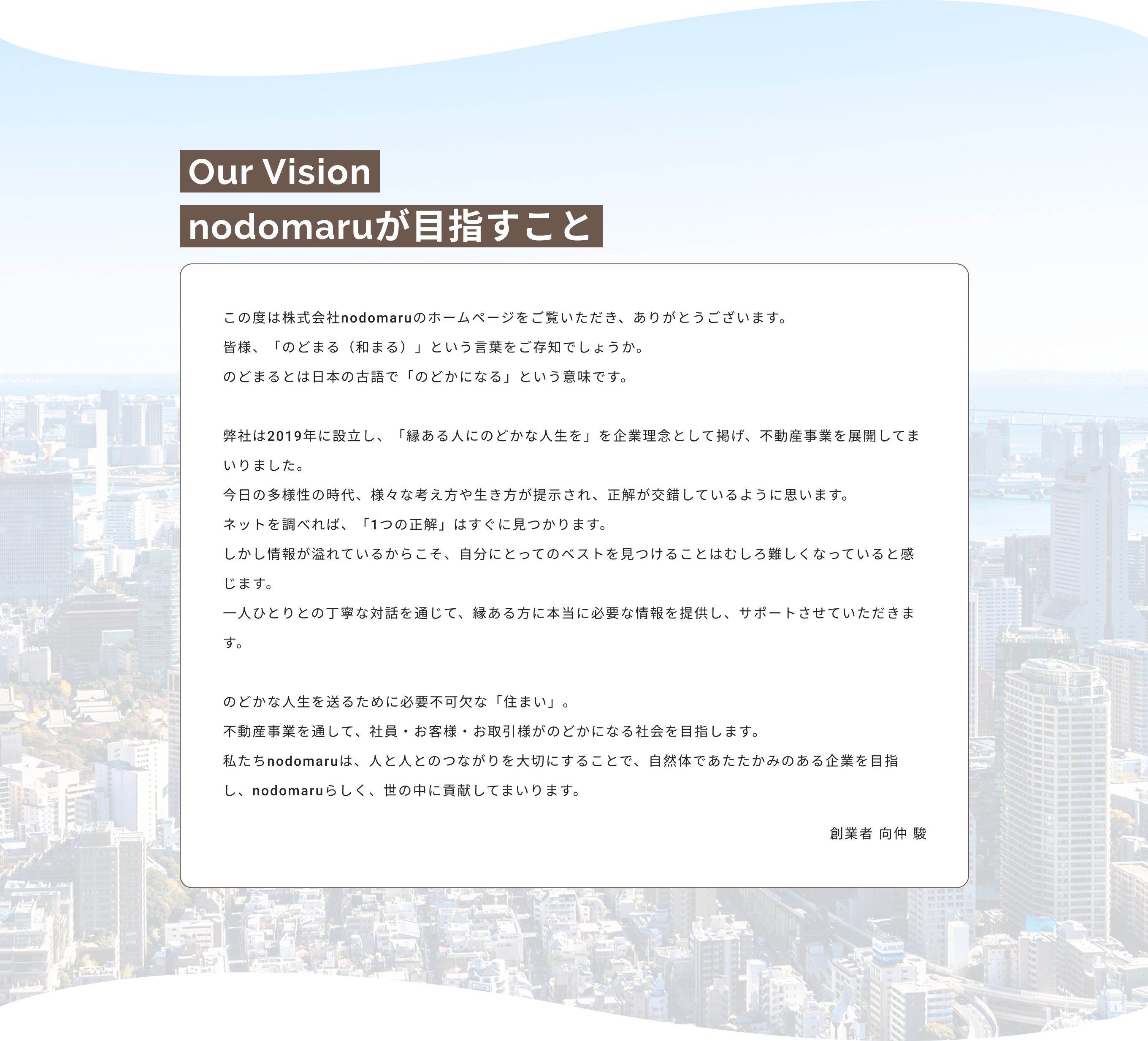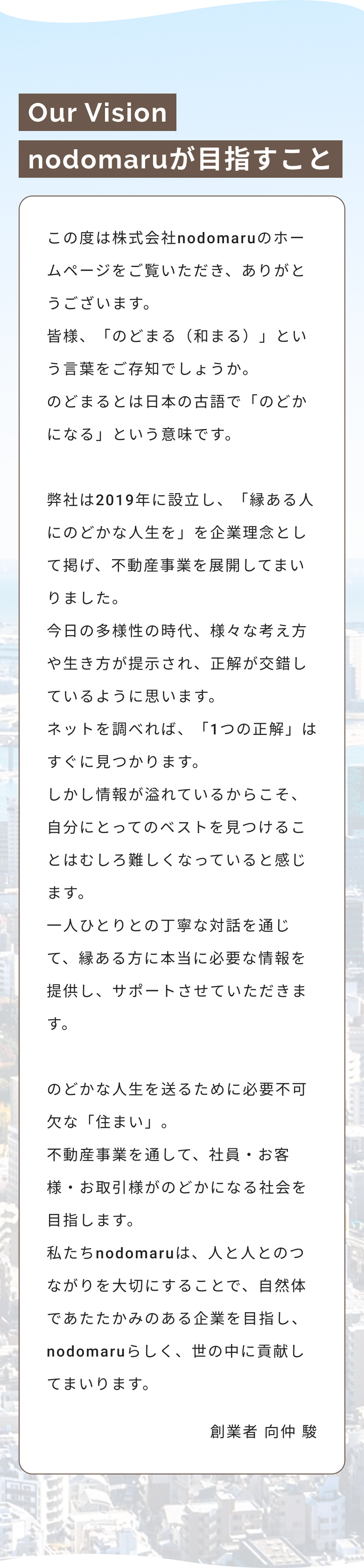We are nodomaru 社名の「のどまる」は、古語で「のどかになる」を意味します。私たちは、不動産を通じて一人でも多くのお客様の「のどかな人生」の実現に貢献することを目指しています。人と人とのご縁を大切にし、自然体で温かみのある企業であり続けます。 We are nodomaru 社名の「のどまる」は、古語で「のどかになる」を意味します。私たちは、不動産を通じて一人でも多くのお客様の「のどかな人生」の実現に貢献することを目指しています。人と人とのご縁を大切にし、自然体で温かみのある企業であり続けます。